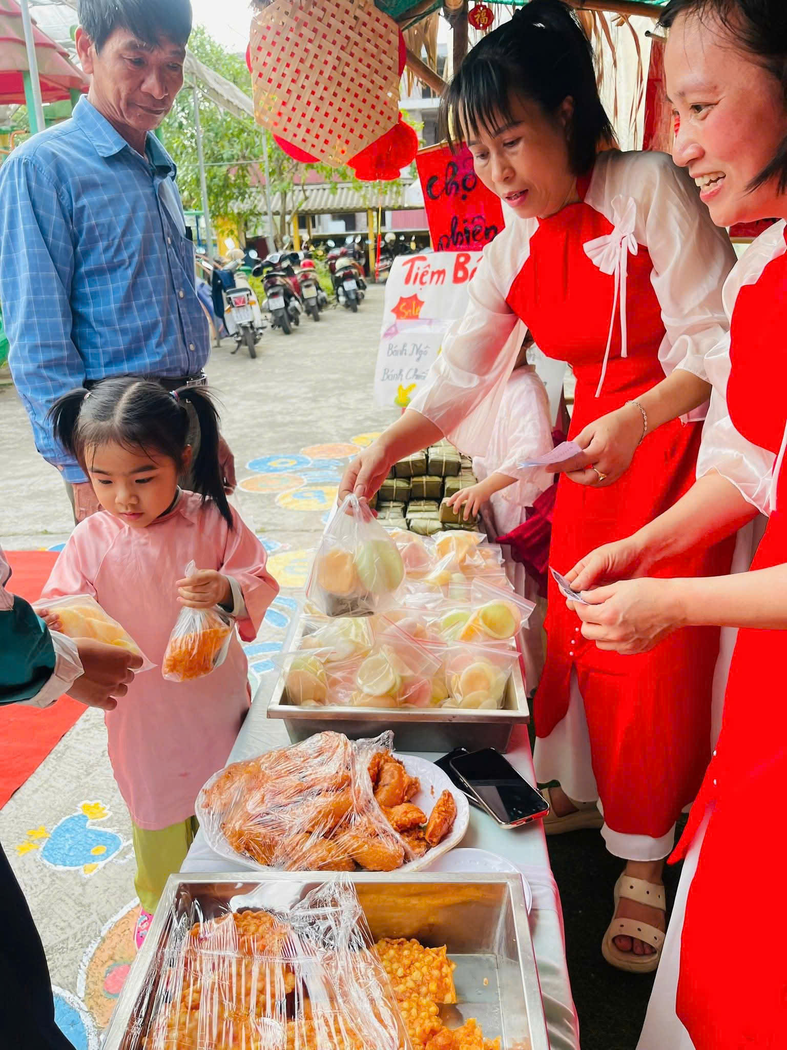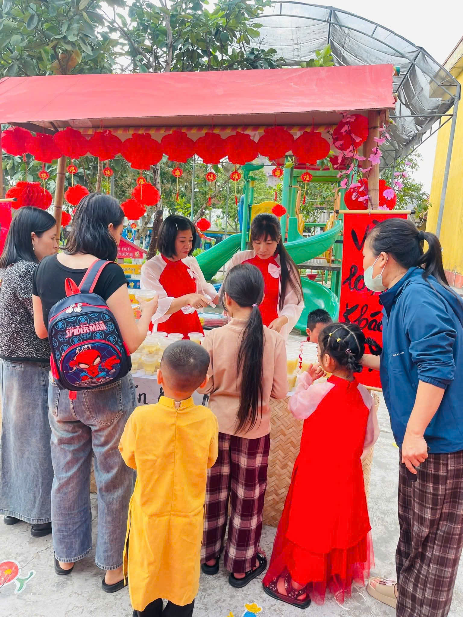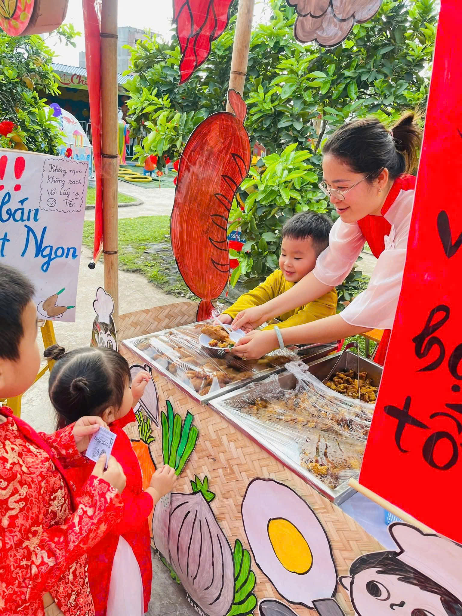Các bé được bố mẹ, ông bà, anh chị dẫn đi tham quan, trải nghiệm các gian hàng, thưởng thức các món ăn đặc trưng của ngày tết dưới hình thức đổi phiếu lấy quà…
